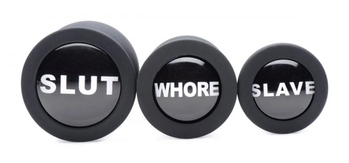 Deze buttplug set heeft drie groottes met taps toelopende punten. Op de onderzijde van elke buttplug staat een Dirty Word zoals 'Slut', 'Whore' of 'Slave'. Geef met de buttplug aan hoe je gemoedstoestand is of in wat voor soort spel jij zin hebt. Ze zijn gemakkelijk in te brengen en eenvoudig schoon te maken.