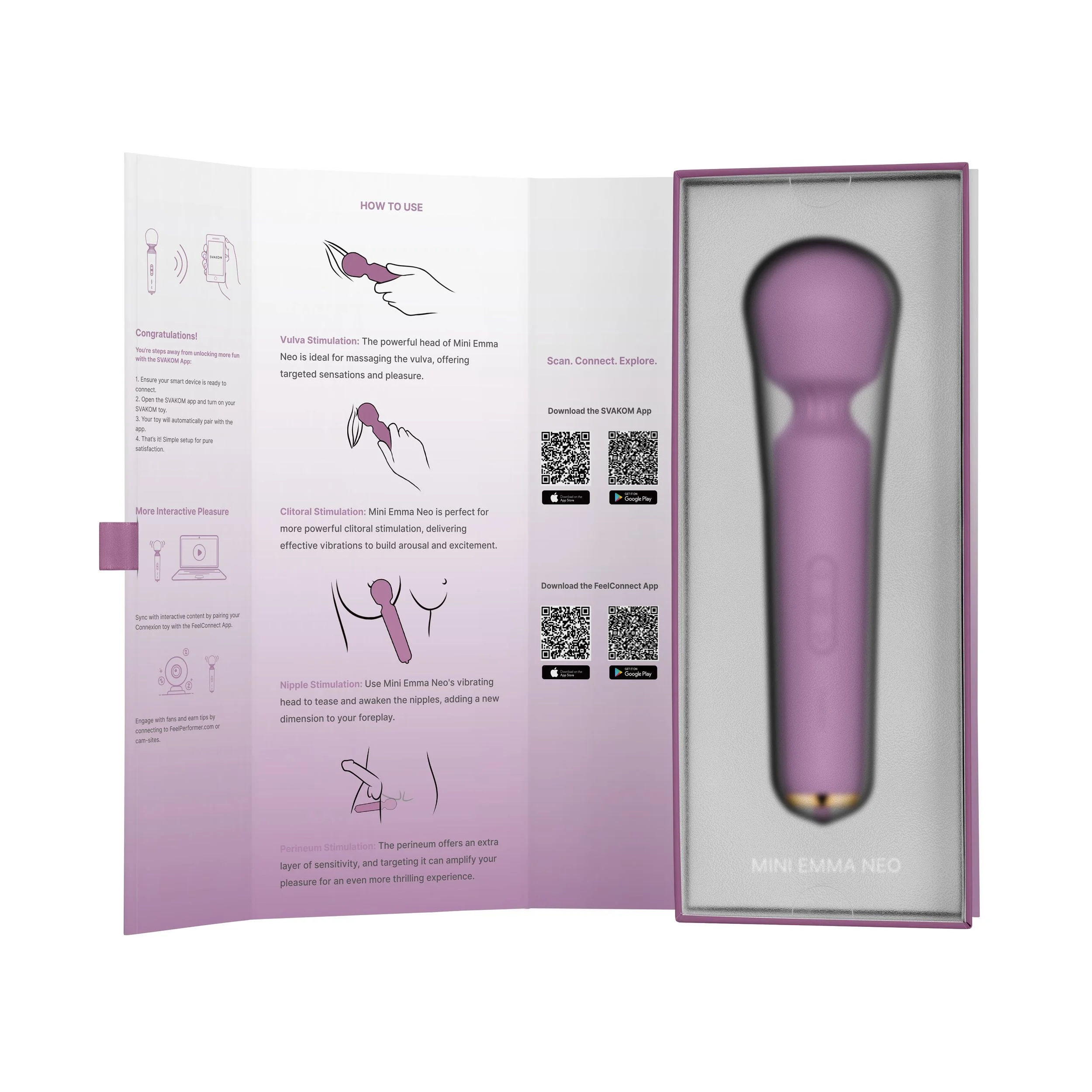 Verbind de Mini Emma Neo met de SVAKOM App en ontdek eindeloze mogelijkheden. Pas de instellingen aan, speel op afstand met je partner, of synchroniseer met interactieve video's en cam-sites voor ultieme controle en genot.