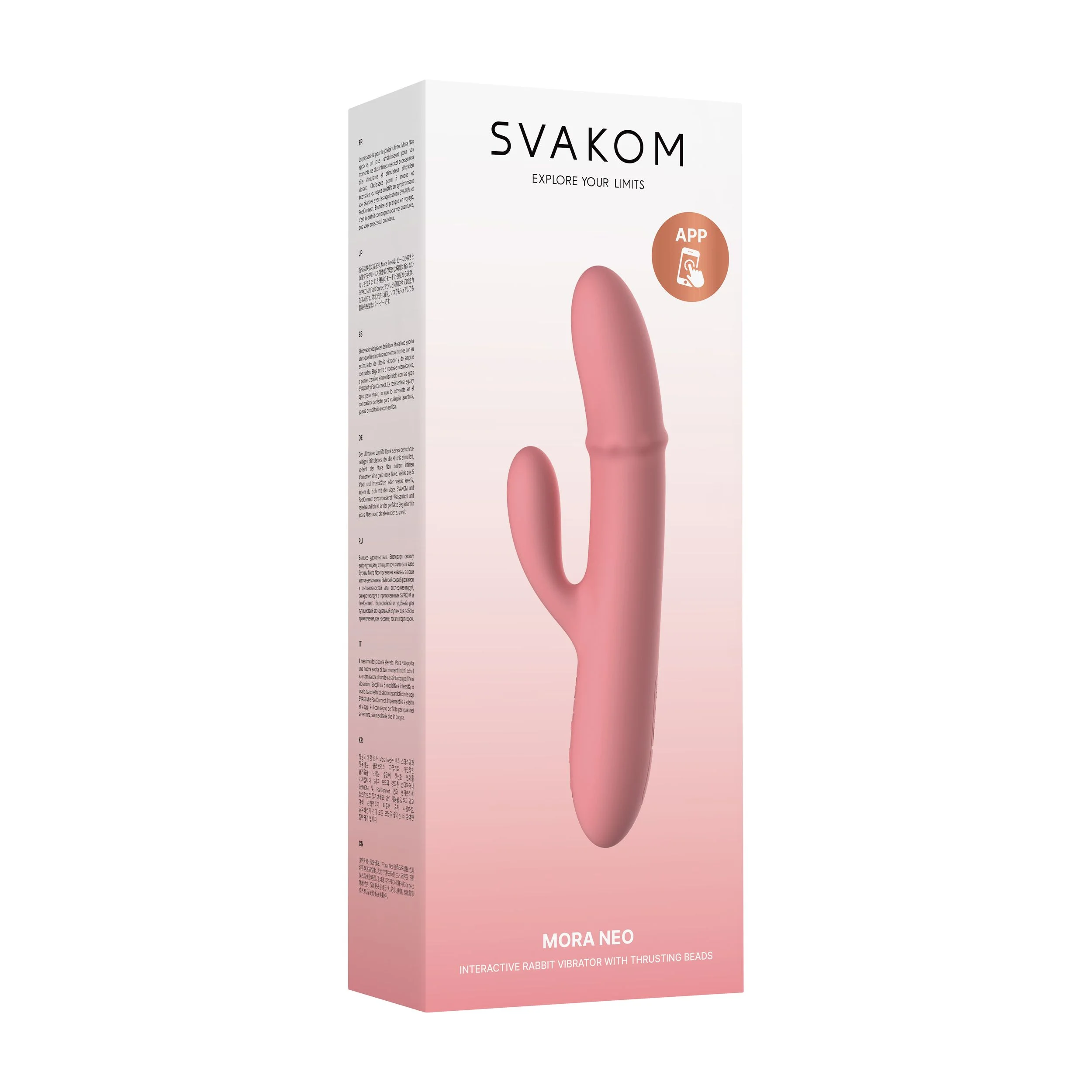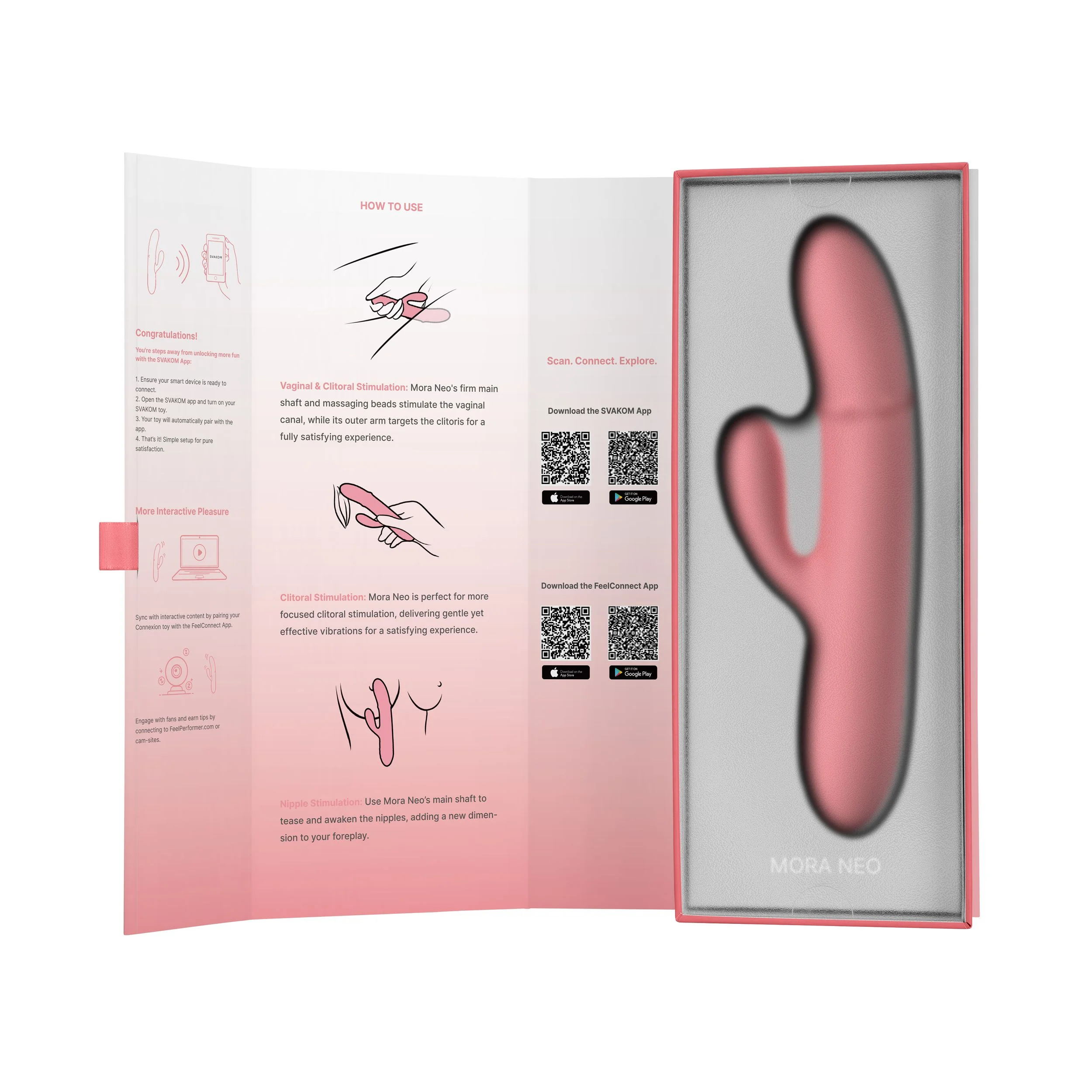 Om toegang te krijgen tot meer instellingen kun je eenvoudig de SVAKOM App downloaden op je Android of Apple. Met de App ontdek je talloze mogelijkheden en zelfs een langeafstandsbediening tussen jou en je partner, waar ter wereld je ook bent! Mora Neo maakt deel uit van de Connexion-serie van SVAKOM en kan ook worden gebruikt voor interactieve video's of de webcam.