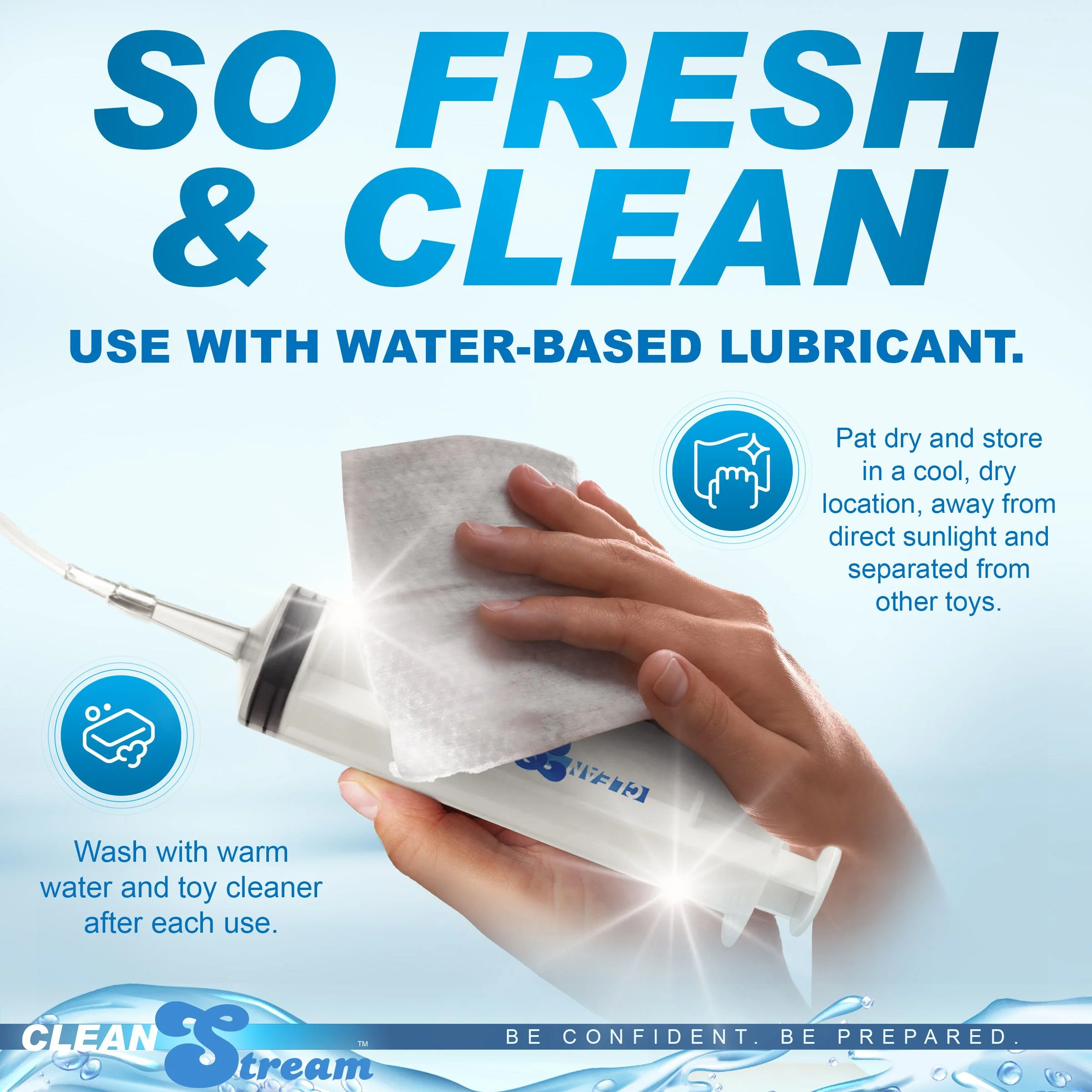 Het ontwerp met gescheiden onderdelen houdt alles schoon; alleen de uitbreidingen worden ingebracht, waardoor de inhoud van de spuit vrij blijft van contaminatie. Na gebruik is alles eenvoudig schoon te maken met warm water en een mild zeepje. Voor een grondigere reiniging kun je de onderdelen ook een tijdje in warm, zeepachtig water laten weken.