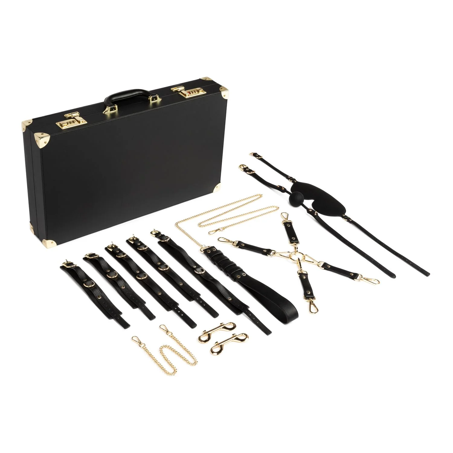 Spanking Paddle, Siliconen Ball Gag, 2 x Karabijnhaak, Blinddoek, Ketting, Hogtie, Fluwelen Zak. Artikelen en koffer gemaakt van PU-leer.