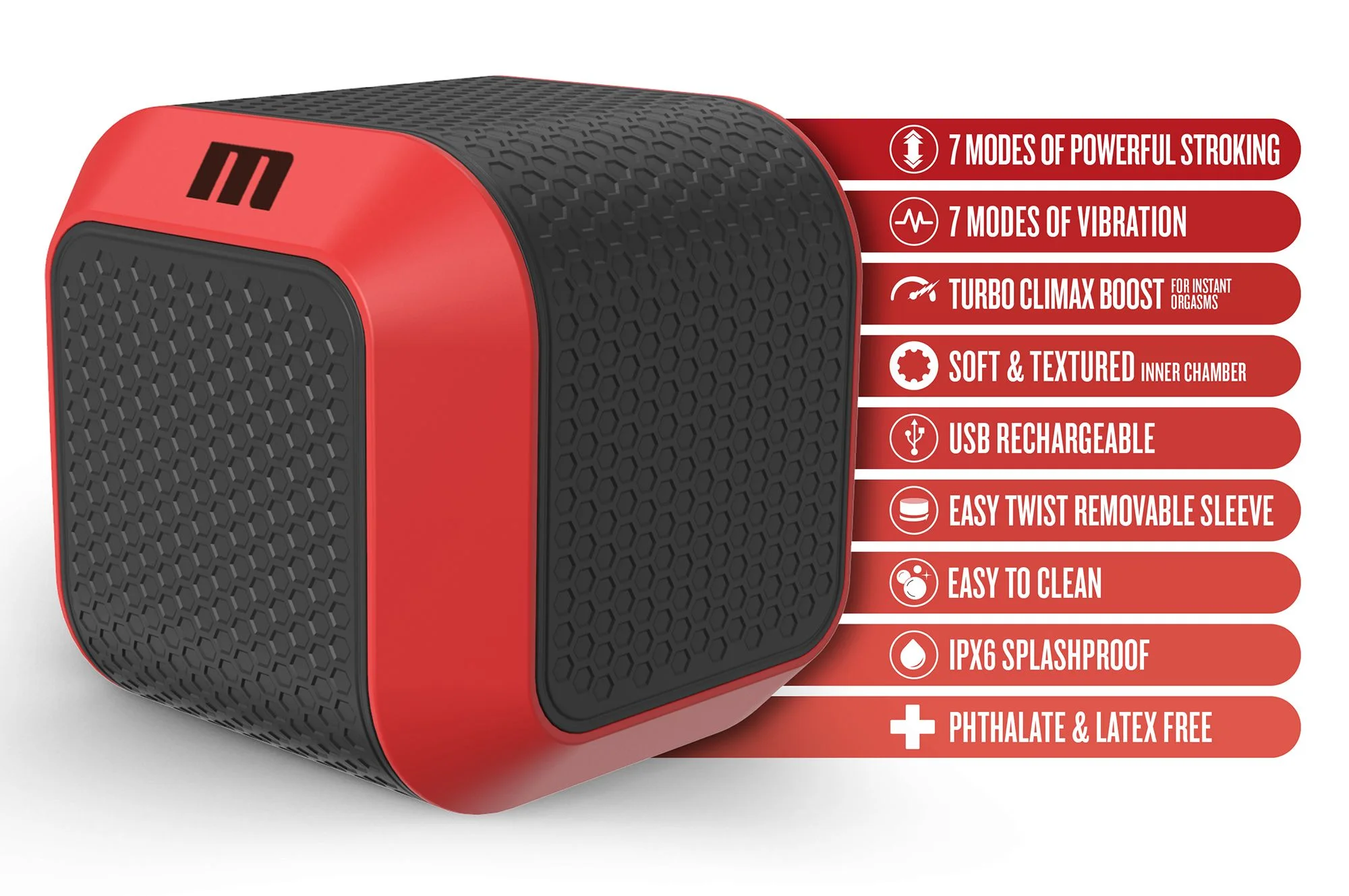 Ontketen je verlangens met de M For Men Slambox! Dit krachtige automatische masturbatie-apparaat is ontworpen voor wie meer eist van zijn masturbator. Verpakt in een discrete, strakke rode box, belooft deze stroker een wilde rit vol sensaties. Met 7 standen van intense roterende stootkracht word je omhelst in een draaikolk van sensaties. Verhoog de intensiteit met elke klik, terwijl de 360° roterende beweging elke centimeter van je penis stimuleert en je naar een intensere, krachtigere climax brengt.