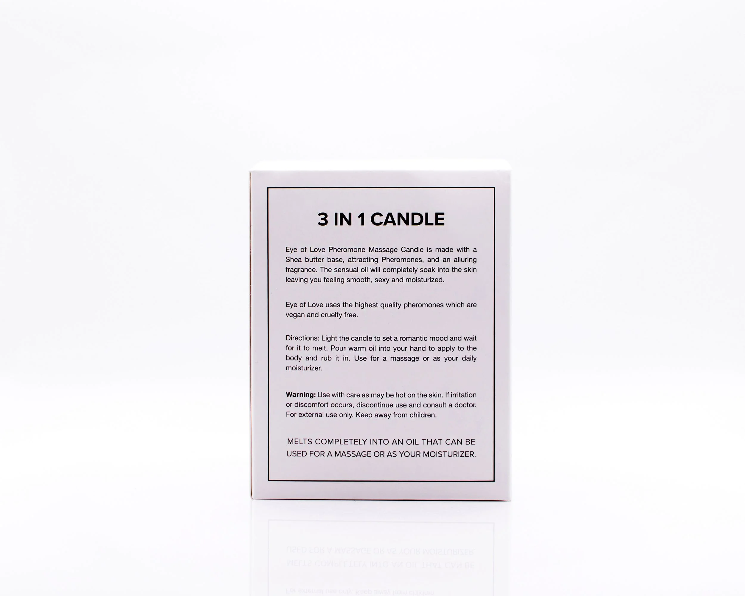 Let op: bij gebruik op een gevoelige huid kan verbranding of reactie van de huid optreden. Het is daarom aan te raden om de massage kaars altijd vooraf aan gebruik eerst op de huid te testen. Doe dit door de kaars na 15-20 branden uit te blazen, een druppeltje was op je handen te gieten en op de huid te testen.