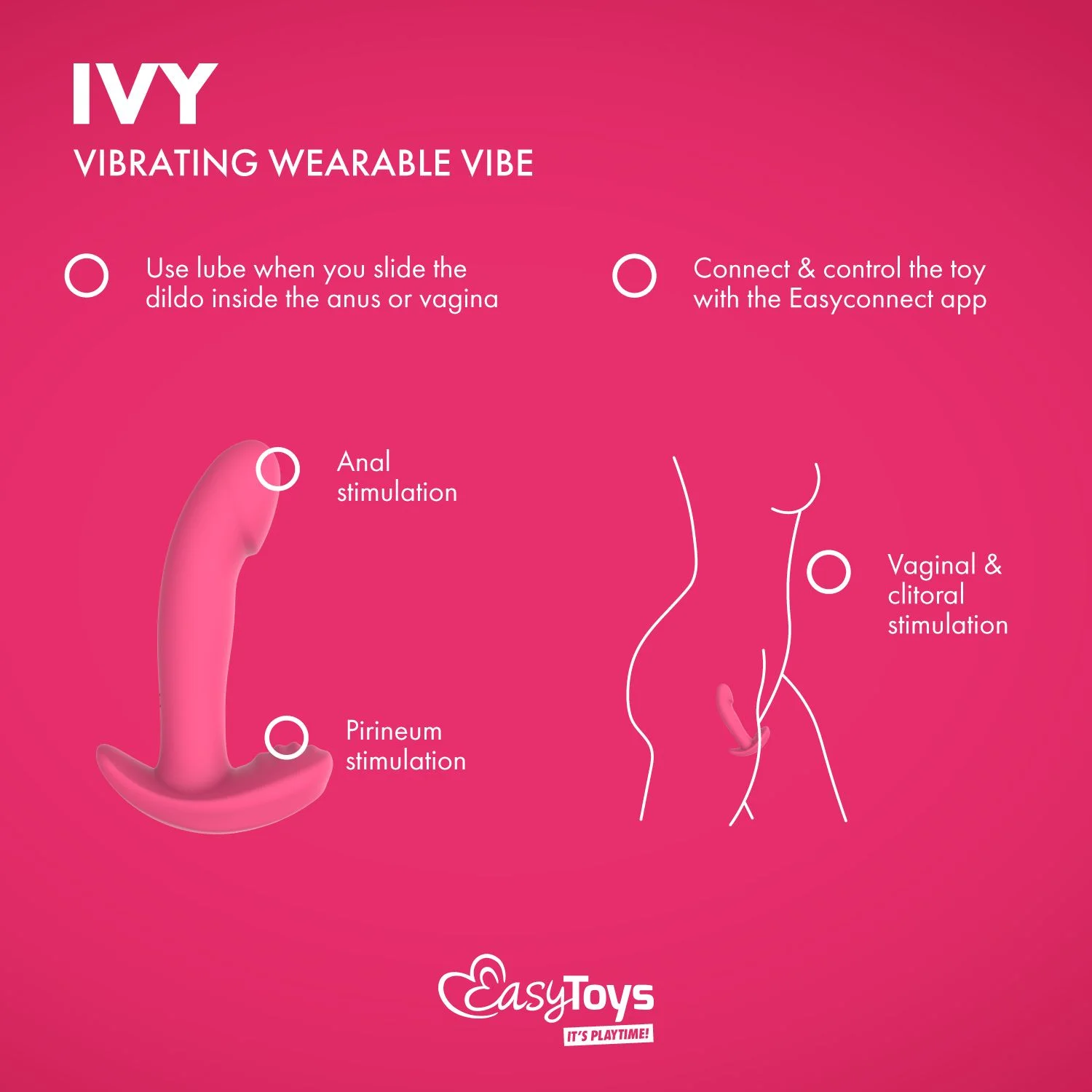 It’s Playtime! Thans, zo staat het op de verpakking. Deze is redelijk eenvoudig, maar elegant en lekker roze. Alles wat je moet weten staat er op en de vibrator zelf is groots afgebeeld op de voorzijde. Ik zeg wel dat het een prostaatvibrator is, maar je zou deze in theorie ook prima vaginaal kunnen inbrengen. Anyway in het doosje krijg je natuurlijk de Ivy vibrator, een USB-oplaadkabel en de handleiding. Niks meer, niks minder. De wearable vibrator is gemaakt van siliconen en heeft maar een knopje aan de onderkant waarmee je ‘m gemakkelijk (ja, echt) kunt verbinden met de EasyConnect-App. De 9 vibratiestanden kun je eveneens met die knop bedienen, of doormiddel van het swipen in de app. Daarnaast is de Ivy geheel waterdicht om op verschillende plekken ervan te genieten.