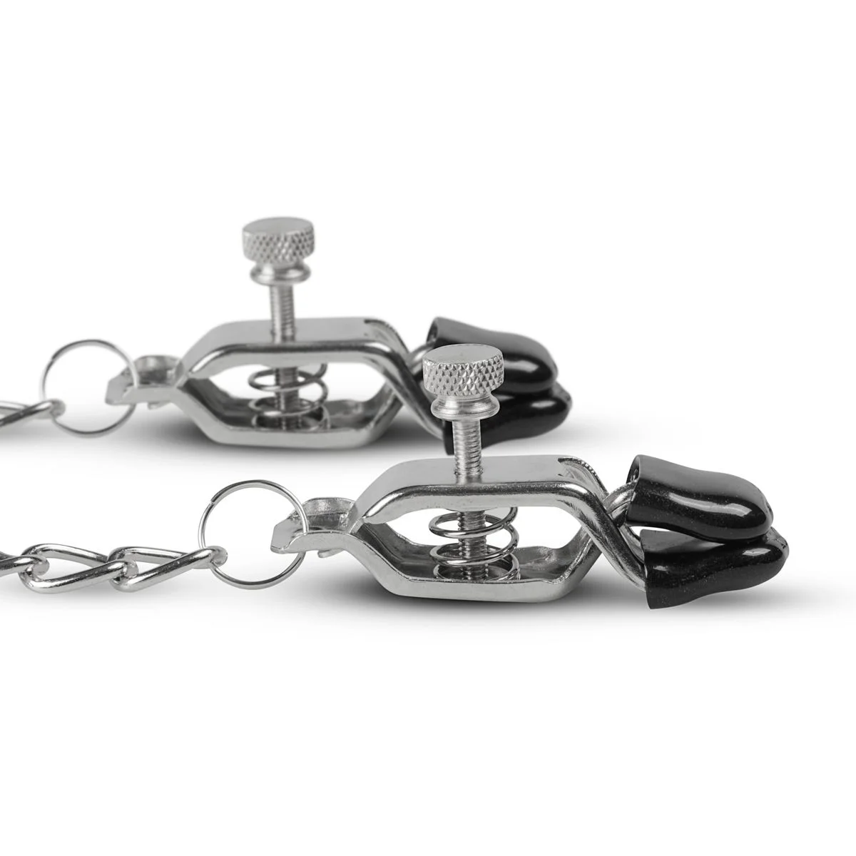 Het fijne aan deze klemmen is de brede bek waardoor er een groter oppervlakte van de tepel gestimuleerd kan worden. Ook het feit dat ze strakker en losser gesteld kunnen worden is een prettige bijkomstigheid. Het kettinkje dat de klemmen met elkaar verbindt kan gebruikt worden om op verschillende manieren te teasen.
