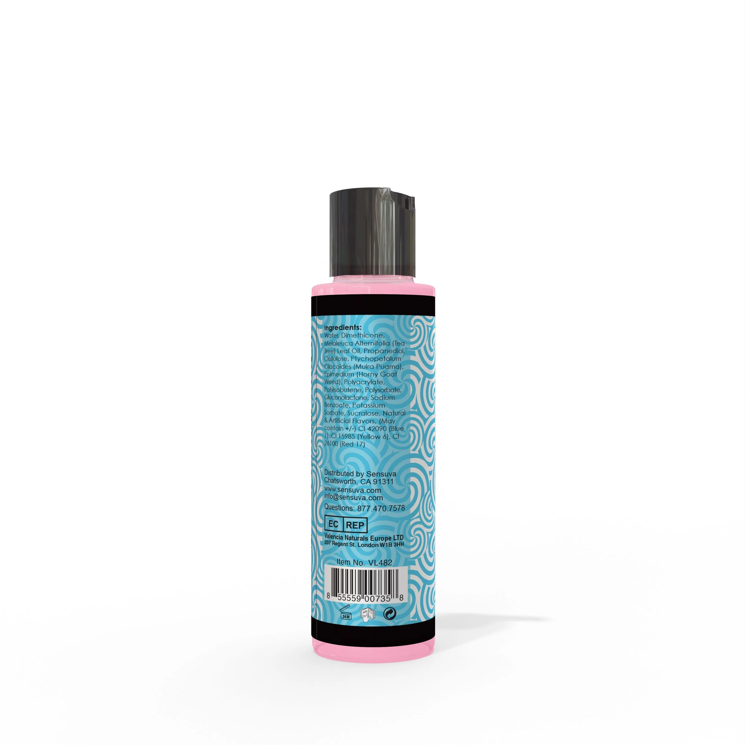 Ingrediënten: Water, Dimethicone, Melaleuca Alternifolia (Tea Tree) Leaf Oil, Propanediol, Cellulose, Ptychopetalum olacoides (Muira Puama), Epimedium (Horny Goat Weed), Polyacrylate, Polyisobutene, Polysorbate, Gluconolactone, Sodium Benzoate, Potassium Sorbate, Sucralose, Natural & Artificial Flavors, (May contain +/-) CI 42090 (Blue 1), CI 15985 (Yellow 6), CI 26100 (Red 17)