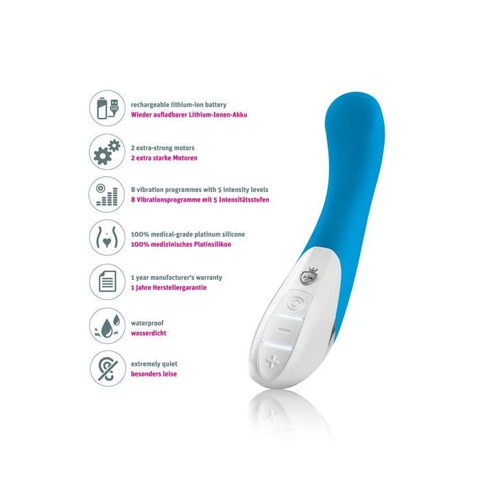 Deze G-spot vibrator van Mystim heeft een gebogen top om zo jouw meest gevoelige plekjes te bereiken. De 2 motoren hebben samen 8 programma's en 5 intensieteitnniveaus. Het materiaal is voelt zacht aan op de huid en deze vibrator is daarnaast volledig waterdicht voor spannende avonturen in bad of onder de douche.
