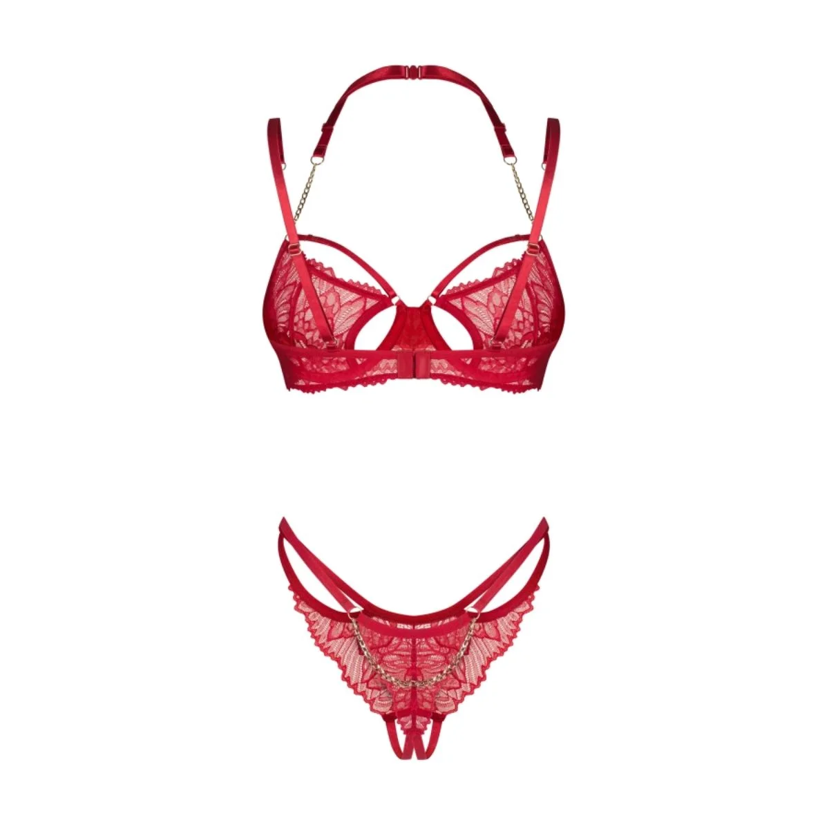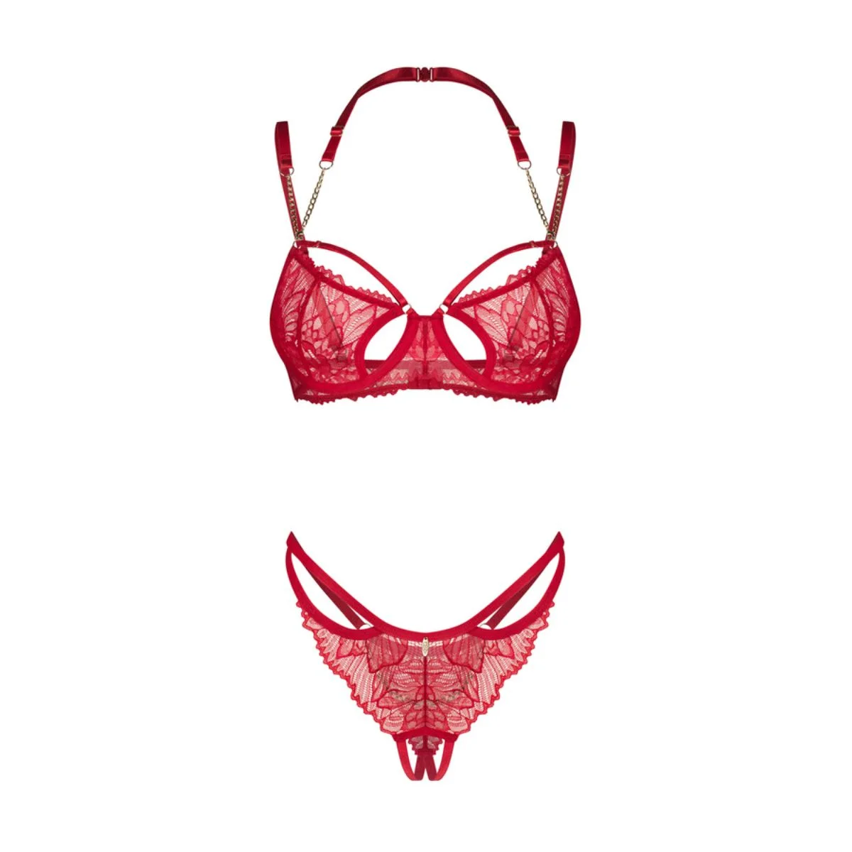 De Obsessive Matildea 2-Delige Open Set is pure luxe en verleiding in één. Deze verfijnde set combineert dieprood kant, glanzende details en een gewaagd open ontwerp dat alle aandacht opeist.