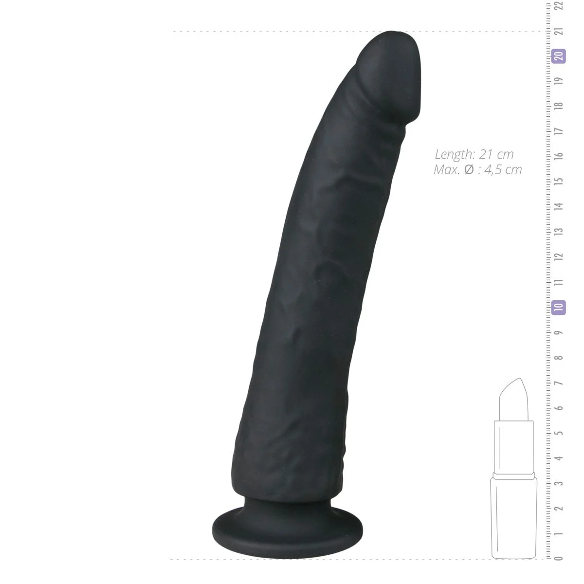 Toen de doos binnenkwam vond ik het formaat op het eerste zien wat tegenvallen, toen ik de dildo uit de verpakking had gehaald en vast had beviel het formaat wel. Flink maar niet te groot. De dildo is van zacht siliconen en erg buigzaam, loopt toe van smal bij de top tot breed bij de basis.