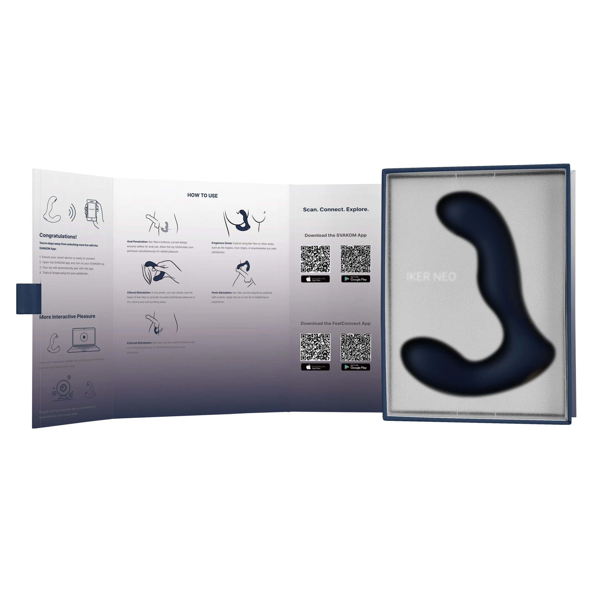 Dankzij de app-connectiviteit via de SVAKOM Connexion Series opent de Iker Neo een wereld aan interactieve mogelijkheden. Je kunt hem synchroniseren met interactieve video’s en camcontent, of de controle op afstand overdragen aan een partner, waar die zich ook bevindt. Pas patronen aan, speel met intensiteiten en ontdek de spanning van long-distance play – rechtstreeks vanaf je telefoon, compatibel met zowel Android als iOS.