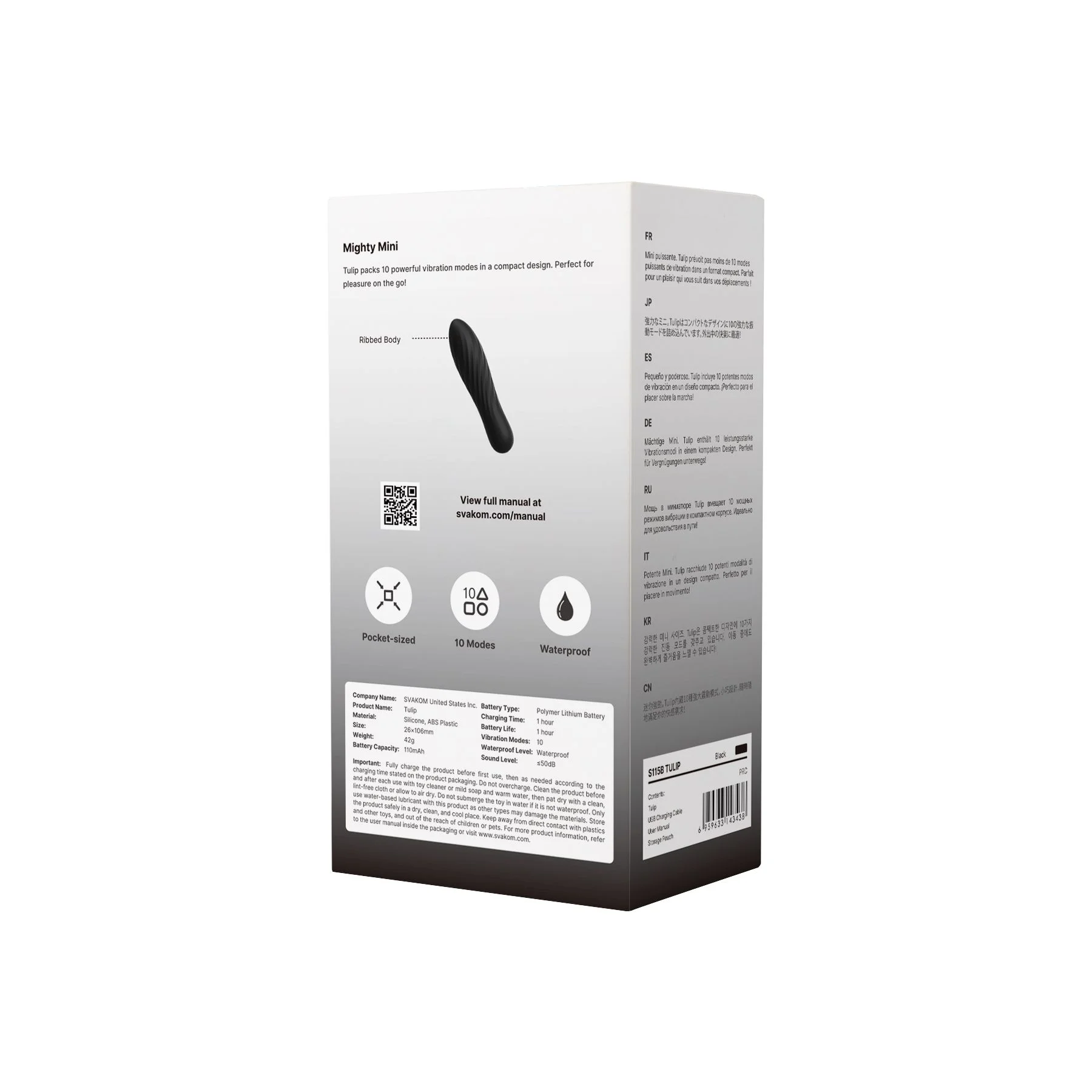 Geniet van intense vibraties met de Svakom Tulip vibrator! Deze vibrator is compact van formaat maar wel zeer krachtig. Zet hem eenvoudig aan met een druk op de knop en schakel eenvoudig tussen 10 krachtige vibratiestanden. De vibrator is voorzien van ultra zacht en lichaamsveilig siliconen dat samen met het geribbelde curve-ontwerp ervoor zorgt dat Tulip comfortabel ingebracht kan worden. Daarnaast is de vibrator geheel waterproof zodat je hem veilig mee kunt nemen in bad of onder de douche.