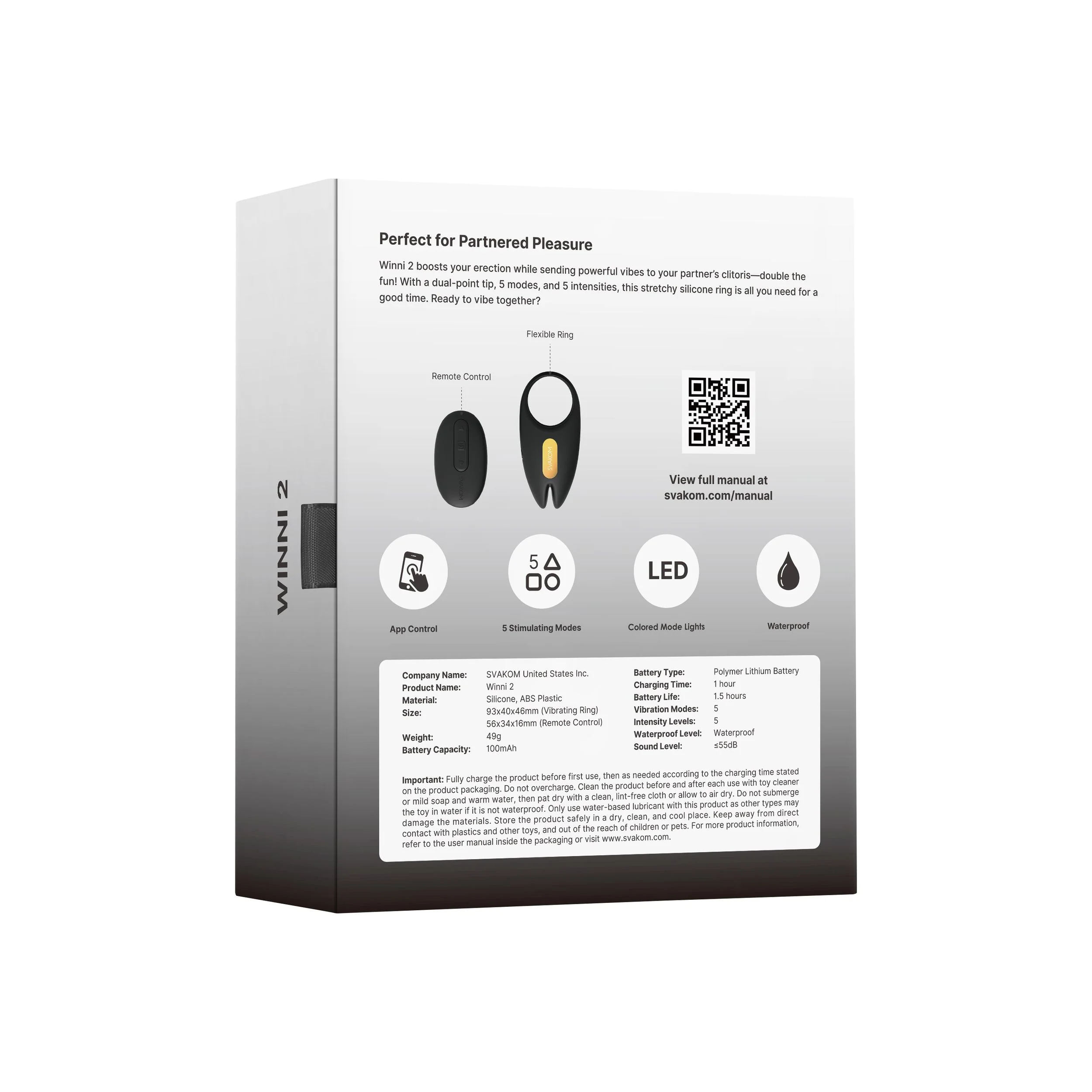 Ben je op zoek naar iets om wat opwinding toe te voegen aan je seksleven? De Winni 2 Penisring is precies wat je nodig hebt! Dit seksspeeltje wordt Bluetooth-gestuurd en werkt met de SVAKOM-app. Het biedt 5 vibratiemodi en 5 intensiteitsniveaus, samen met aanpasbare vibratiepatronen met LED-lampjes. Het is gemakkelijk schoon te maken, waterdicht en perfect voor solo of koppelspel. Voeg wat opwinding toe aan je nachten met de Winni 2 Penisring!
