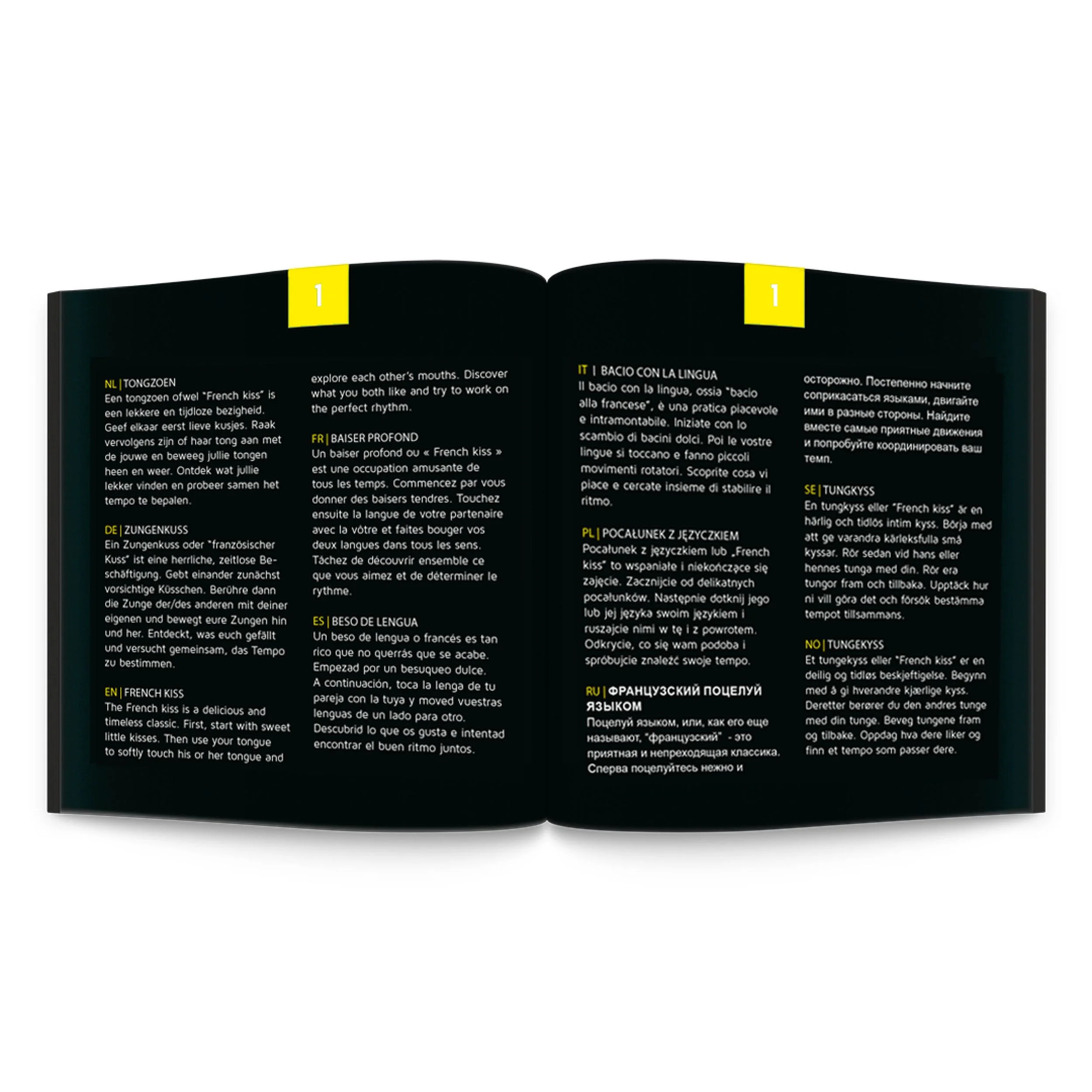De pijl wijst naar het nummer dat bepaalt welke intieme kus voor jou in petto is. De 24 uitdagingen in de Kiss-editie zijn beschikbaar in 10 talen: Engels, Spaans, Duits, Nederlands, Pools, Russisch, Italiaans, Zweeds en Noors, en geven een opwindende draai aan je seksleven voor nog meer gepassioneerde zoenen. Laat je verrassen, plezieren en verleiden, en vooral: neem de tijd om van elkaar te genieten. Kussen zal altijd leuk blijven!